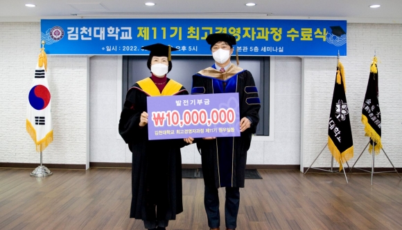 이 자리에서 11기 29명의 수료생들은 학교발전을 기원하는 마음으로 발전기부금 1천만원을 전달하였다.최고경영자과정 11기는 2021년 3월 입학식을 시작으로 1년간 매주 목요일 경영이론과 기법, 문화, 교육, 건강, 명사특강 등 최고의 CEO리더로서 갖추어야할 다양한 덕목을 익혀왔다.윤옥현 총장은 기념사를 통해 “수료를 진심으로 축하하며, 수료생들의 모교가 된 김천대학교가 늘 함께 하겠다. 김천에 오피니언 리더들의 산실인 김천대학교 최고경영자과정에서 동문들과 함께 앞으로 더욱 발전하고 무궁무진하게 뻗어나가는 김천대학교 최고경영자과정 총교우회 일원들이 되시길 바란다”고 하였다.박종철 총교우회 부회장은 “김천대학교 최고경영자 총교우회가 김천의 중심이 되어가고 있는 현재에 11기 원우들도 함께 할 수 있어서 기쁘다. 수료 후에도 11기 원우들의 활동과 정보교류를 통하여 지역사회에서 큰 활약을 할 수 있기를 기대한다.”고 전했다.이어서, 이상업 11기 회장은 “11기가 어색한 첫만남으로 시작되었지만 어색한 시간도 잠시, 많은 만남의 시간들에 늘 적극적이고 열정적이었던 11기 교우들 덕분에 항상 좋은 추억이 만들어졌다. 교우들의 많은 참여가 교우 상호간의 생각의 방향이 만들어져 추진력을 얻었고, 교우회의 목적인 모교와 지역사회 발전에 대해 한번더 생각하는 기회였다. 늘 많은 노력을 해준 우리 교우들이 너무 자랑스럽다.”라고 답사를 하였다.김천대학교 최고경영자과정은 2012년 3월 시작으로 현재까지 총311명의 수료생을 배출하였다. 이제는 명실상부한 지역 최고경영자과정으로 발전하였으며, 수료생을 중심으로 총교우회가 발족되어 지역 발전의 중추적인 역할을 담당하고 있다.