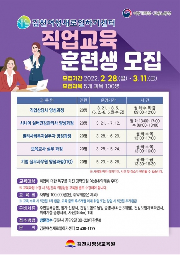 김천시평생교육원 여성새로일하기센터에서 지난 2월 28일부터 3월 11일까지 국비지원 직업교육훈련생을 모집하고 있다.직업교육훈련은 경력단절여성의 취업역량을 강화하고 지역사회 및 산업체의 요구에 적합한 여성 전문 인력을 양성하는 프로그램으로 전액 국비지원으로 운영된다.교육과정은 △직업상담사 양성과정(3. 21∼8. 5), △시니어 실버건강관리사 양성과정(3. 21∼7. 12), △멀티사회복지실무자 양성과정(3. 28∼6. 29) △보육교사 실무과정 20명 (3. 28∼5. 24), △기업 실무사무원 양성과정 (5. 23∼8. 26) 총 5개 과정을 운영하며, 과정별 20명씩 총 100명을 모집할 예정이다.취업을 희망하는 경력단절여성은 누구나 신청 가능하며, 참가신청서, 건강보험료 납입증명서, 취약계층 증빙서류(해당자에 한함)를 지참하여 방문접수하면 상담·면접심사를 거쳐 직업교육훈련생으로 선발한다.기타 궁금한 사항은 김천시평생교육원 김천여성새로일하기센터(430-1179)에 문의하거나 김천시청 홈페이지 또는 김천시 평생교육원 홈페이지를 참고하면 된다.김천여성새로일하기센터는 올해 주요 사업으로 △취업대비 집단상담프로그램 △직업교육훈련 △새일여성인턴십 지원 △찾아가는 취업지원서비스 △여성친화일촌기업 협약 △취업자 및 기업체 사후관리 등 교육에서 취업까지 원스톱으로 지원하고 있다.