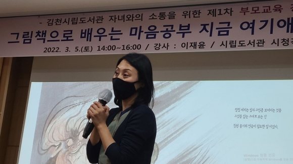 김천시립도서관(관장 배정화)에서는 북 큐레이터이자 명상 전문가 이재윤 강사를 초청, ‘책으로 배우는 마음공부’란 주제로 제1차 부모교육 강좌를 진행하여 참가한 부모님들에게 큰 호응을 받았다.이재윤 작가는 수묵화로 담아낸 어른들을 위한 명상 그림책「지금 여기愛」를 함께 보며, 내 마음을 알아차리고 자기 자신을 향한 연민 어린 마음이 얼마나 필요한 일인가에 대해 이야기를 나누었다.작가는 자신의 경험을 진솔하고 담담하게 풀어내며 “자녀와의 소통에서 가장 중요한 것은 내 마음을 알아차리고 마주하는 것이며, 지혜로운 부모는 먼저 자신을 사랑하고, 타인을 사랑하고, 모두를 사랑하는 마음 안에서 진정한 행복을 느낀다.”고 강조했다.코로나로 정서적 안정이 필요한 시기에 열린 이번 강연은 제주에서 직접 재배한 ‘로즈마리’로 자연이 주는 치유의 힘과 부모들이 일상에 행복감을 더 할 수 있는 명상 체험 시간을 더해 지친 나를 돌아보고 다독이는 시간으로 마무리했다.강좌에 참여한 한 부모는 “뜻밖의 마음챙김 시간으로 온전한 나를 보고 위로 받은 특별한 날이었고, 책과 명상을 통해 육아에 지친 마음의 처방전을 받은 소중한 시간이었다.”고 소감을 전했다.김천시립도서관 제2차 부모교육 강좌는 「미래형 인재의 3가지 즐거움」이라는 주제로 김민식 작가(前 MBC PD)를 초청하여 3월 15일(화)에 강연을 개최할 예정이다. 보다 자세한 내용은 김천시립도서관 사서팀(☎054-421-2845)으로 문의하면 된다.
