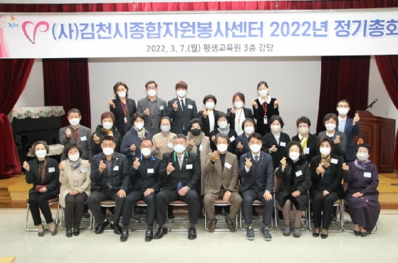 (사)김천시종합자원봉사센터 2022년 정기총회가 3월 7일(월) 오후 2시 김천시평생교육원 대강당에서 강병직 이사장과 이사 및 감사, 정회원 등 30여명이 참석하여 진행됐다.