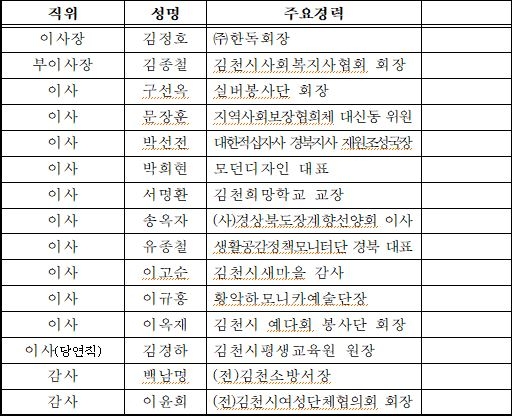 (사)김천시종합자원봉사센터 이사회 명단(15명)