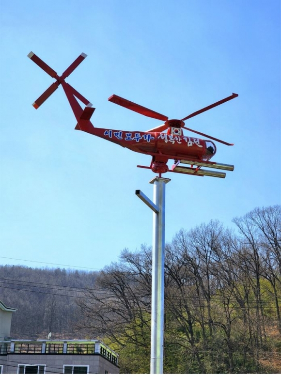 김천시 대항면(면장 최정숙)은 청사에 산불조심과 면민이 하나 된 열정으로 더 높이 힘차게 도약할 수 있도록 행복을 기원하는 조형물을 설치했다고 밝혔다.이번 조형물은 대항면의 발전을 기원하고자 노인두(한국농촌지도자 중앙연합회 대외협력 부회장)씨가 제작비를 지원하고, 운수리에 거주하는 윤신원씨가 제작을 맡았으며, 가로2.8m, 높이4m, 두께35cm의 헬기모양으로 제작해 청사 왼편에 설치됐다.또한 조형물의 왼편에는‘산불조심’, 오른편에는‘시민모두가 행복한 김천’을 기재하여 면민의 행복과 산불 없는 대항면을 기원하고, 김천시 홍보캐릭터 오삼이 인형을 운전석에 앉혀 한층 의미를 더했다.노인두 부회장은 “대항면민이 모두 건강하고 행복하기를 바라는 마음으로 조형물 제작에 참여하게 됐다.”고 했으며,최정숙 대항면장은 “대항면을 위해 좋은 일에 보탬이 돼 주신 노인두 부회장님과 윤신원씨께 감사의 말씀을 드린다.”며 “주민들의 염원을 담아 대항면이 더욱더 행복하고 발전될 수 있도록 면 직원들과 함께 최선의 노력을 다하겠다.”고 말했다.