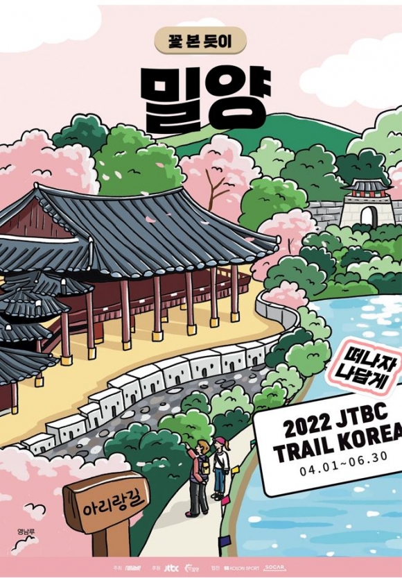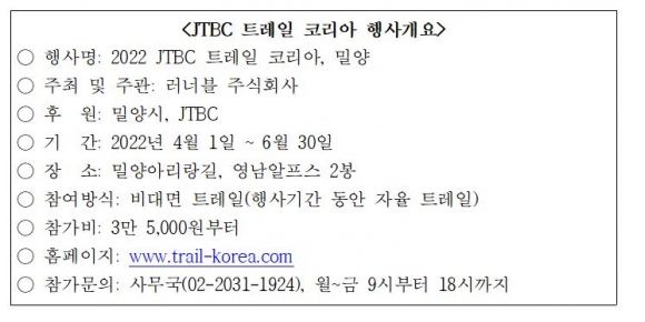 밀양시(시장 박일호)는 오는 4월부터 6월까지 비대면 트레일 프로그램인 ‘2022 JTBC 트레일 코리아’를 개최한다고 밝혔다.‘2022 JTBC 트레일 코리아’는 참가자가 지정된 코스를 걷기 또는 달려서 완주하는 비대면 프로그램으로 밀양을 포함해 서울, 강릉, 순천 등 전국 4개 지역에서 동시 진행된다.