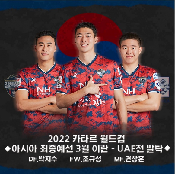 14일 대한축구협회는 3월에 열릴 2022 카타르 월드컵 아시아 최종예선 9차전(이란), 10차전(UAE)에 나설 선수단 명단을 발표했다. 김천상무에서는 조규성, 박지수, 권창훈이 이름을 올렸다.조규성은 지난해 8월 23일, 국가대표 명단 발표 당시 깜짝발탁으로 화제를 모은 이후 꾸준히 벤투호에 포함되며 기량을 증명하고 있다. 지난 1월 말, 조규성은 ‘2022 FIFA 카타르 월드컵 최종예선 A조’ 레바논 전에서 결승골을 기록하며 대한민국의 월드컵 본선 진출에 기여했다.이번에도 황의조와 함께 단 두 명의 공격수로 국가대표에 발탁되며 본인의 가치를 증명한 조규성은 “대표팀 발탁은 언제나 영광스럽다. 매 순간 초심을 잃지 않고 팀과 함께 더 나아가도록 하겠다”고 발탁 소감을 전했다.도쿄올림픽 와일드카드로도 뽑히며 수비수로서의 능력을 증명했던 박지수는 “대표팀에 발탁되어서 정말 영광스럽고 좋다. 군인이라는 신분을 잊지 않고 최선을 다해 잘 준비해서 다녀오겠다. 수사불패의 정신으로 모든 과정에 임하겠다”고 말했다.권창훈은 입대 후 두번째 발탁이다. 첫 소집에서 치렀던 ‘2022 FIFA 카타르월드컵(예선) 최종예선 A조’ 시리아 전에서 권창훈은 득점과 함께 남자 축구 국가대표팀의 월드컵 본선 진출 확정을 안겼다.권창훈은 “월드컵 예선 마지막 두 경기를 남겨두고 군인 신분으로서 대표팀에 합류할 수 있어서 정말 감사하고 영광이다. 군인임을 잊지 않고 남은 두 경기도 잘 준비해서 우리나라가 조 1위로 마무리 할 수 있도록 희생하고 노력하겠다”고 각오를 전했다.한편, 국가대표가 속한 김천상무는 오는 19일 오후 7시, 전주월드컵경기장에서 전북현대와 ‘하나원큐 K리그1 2022’ 6R 원정 경기를 치른다.