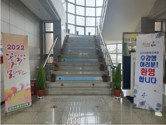 「2022년 평생교육 정기강좌」가 배움을 향한 시민들의 뜨거운 열정을 담아 3월 14일(월) 드디어 개강됐다.김천시평생교육원에서는 오랫동안 평생교육을 기다려온 수강생들을 위해 ‘2022년은 꽃길만 걸으세요’라는 슬로건으로 꽃길 이벤트를 준비하여 수강생들을 맞이했다.