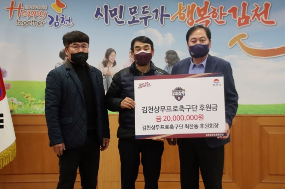 김천상무프로축구단이 14일 김천시청 접견실에서 에코비트워터, 최한동 후원회장의 후원금 전달식을 진행했다.에코비트워터(대표이사 김인석)는 환경기초시설 관리·운영업체로 국내 수처리 분야 점유율 1위의 상하수도 전문기업이다. TSK코퍼레이션과 에코솔루션그룹(ESG)의 합병 계약으로 체결된 에코비트의 자회사로 공공 환경기초시설 국내 최다 운영실적을 보유하고 있다.에코비트워터의 전신인 TSK워터는 지난해에도 김천상무에 후원하며 김천상무의 발전을 응원한 바 있다.최한동 후원회장은 2021년부터 김천상무의 후원회장을 맡아 김천상무의 후원 및 홍보에 앞장섰다. 지난해 후원금 2천만원 전달에 이어 올해도 2천만원의 후원금을 전달하며 김천상무의 발전에 기여했다.김인석 에코비트워터 대표이사는 “지난해에 이어 올해도 김천상무에 후원금을 전달하게 돼 기쁘다. 김천상무의 K리그1 선전을 응원하고 상무프로축구단의 김천시 내 정착을 위해 힘쓰겠다”고 말했다.최한동 후원회장은 “후원회장으로서 김천상무를 알리고 후원사, 후원자들을 모으는데에 이바지하고 있다. 김천상무의 발전을 위해 최선을 다하겠다”고 전했다.한편, 구단 후원에 대한 자세한 사항은 김천상무 마케팅팀으로 전화 문의할 수 있다.