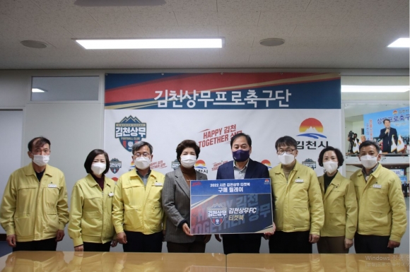 김천상무프로축구단이 15일 오후 김천상무 대표이사실에서 김천시청 복지기획과, 사회복지과, 가족행복과, 환경위생과, 자원순환과와 김천시 평생교육원의 티켓북 구매 릴레이 행사를 진행했다. 행사에는 김경희 복지환경국장을 비롯해 5개 과 전체가 참여했다. 5개 과는 각 1개 씩 티켓북을 구매했다.김천상무 김충섭 구단주를 필두로 시작한 티켓북 구매 릴레이 행사를 통해 지금까지 200여 권이 넘는 티켓북이 팔렸다. 김천시 내 각종 인사 뿐 아니라 김천시민, 김천상무 팬들까지 동참하며 2022 시즌 김천상무 티켓북이 성황리에 판매됐다.2022 시즌 티켓북은 개별 종이 형태로 된 입장권으로 티켓북 소지자 누구든 티켓 내의 난수 번호를 입력해 온라인으로 사전 예약한 후 경기를 관람할 수 있다. 티켓북 1권에는 20매의 티켓이 포함돼 있으며 정가(240,000원)의 50%로 할인된 금액인 120,000원으로 구매할 수 있다. 예매 가능 구역은 가변석(테이블 석 제외), 일반석 전 구역이다. 티켓북은 온라인 티켓링크, 김천상무 온라인 쇼핑몰 또는 김천상무 사무국 방문을 통해 구매 가능하다.한편, 김천상무 사무국으로 전화 문의 시 김천상무 팬 누구나 티켓북 구매 릴레이 행사에 동참할 수 있다.