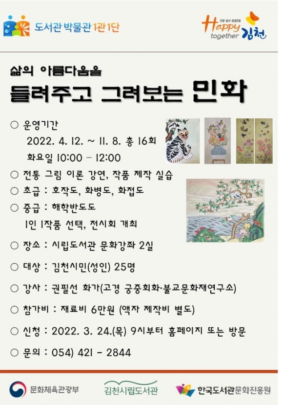 올해 프로그램은 우리 전통 그림을 처음 접하는 초보자부터 작년 사업에 참여해 작품을 제작해 본 중급자까지 다양한 민화를 제작하고 작품 전시회를 개최할 예정이다.사업은 오는 4월 12일(화)부터 11월 8일(화)까지 총 16회에 걸쳐 운영하며, 세부내용과 참가자 모집에 관한 사항은 김천시립도서관 홈페이지를 참조하거나 사서팀(☎054-421-2844)으로 문의하면 된다.배정화 시립도서관장은 “작년 「1관 1단」사업이 시민들의 높은 호응으로 성황리에 운영되었던 만큼 올해도 삶에 아름다운 가치를 더해줄 수 있는 뜻깊은 프로그램이 될 것으로 기대한다.”면서 “우리 그림에 관심이 있는 시민들의 많은 참여를 바란다.”고 말했다.