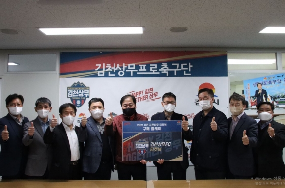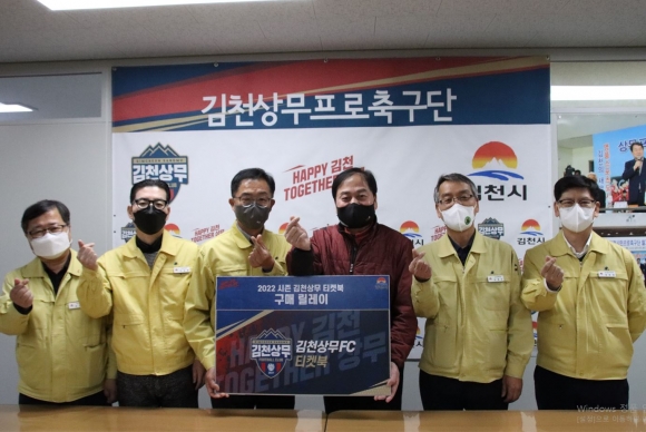 김천시청 건설안전국, 김천시 농업기술센터, 김천시 보건소가 김천상무 티켓북 구매 릴레이 행사에 동참했다.김천상무프로축구단이 22일 김천상무 대표이사실에서 티켓북 구매 릴레이 행사를 열었다.