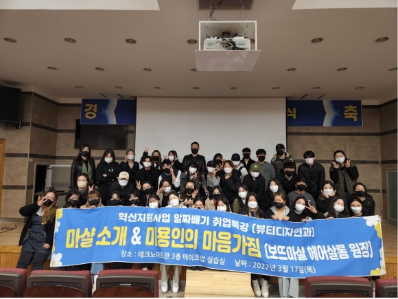 경북보건대학교(총장 이은직) 뷰티디자인과는 재학생들의 현장실무중심의 역량을 갖춘 맞춤형 전문 인재 양성 및 미용 실무능력 배양을 위해 「알짜배기 취업특강」을 실시하였다.이번「알짜배기 취업특강」프로그램에는 보뜨마샬 헤어살롱 한사무엘 원장이 강사로 참여를 하였고, 재학생의 실무역량 강화 및 현장실무교육 강화를 목적으로 프랜차이즈 매장운영과 특징에 대한 이해 및 미용인의 자세와 마음가짐에 대한 내적 역량 강화를 통해 취업 준비 역량 향상을 위해 지난 3월 17일 목인관 시청각실에서 진행되었다.