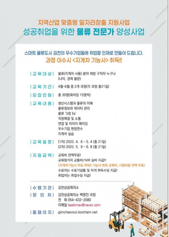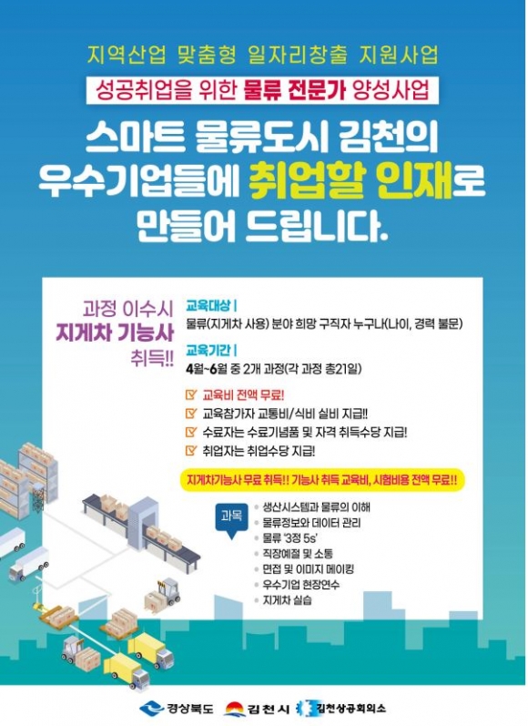 최근 김천시는 ‘경북 스마트 그린물류 규제자유특구’로 지정됐을 뿐만 아니라 전국 최초로 ‘네거티브 입주 규제’를 도입해 국내 최대 이커머스 업체인 쿠팡이 첨단물류센터 조성하는 등 유통 및 물류중심도시로서 우리지역의 여건에 맞는 새로운 인력양성과 일자리를 창출 모델로 진행될 예정이다.코로나19로 인한 비대면 소비와 온라인 생활물류 수요가 크게 늘어난 상황에서 물류 전문가를 양성하여 지역 일자리 강화와 고용환경 개선을 위해 사전 수요조사를 기반으로 지역 기업들이 요청하는 인력을 양성하고, 일자리를 연계하는 지역산업맞춤형 사업을 활성화하기 위해 김천상공회의소는 김천시와 함께 적극 협력하기로 했다.오는 4월 6일부터 총 21일간 84시간 과정으로 2회에 걸쳐 교육과정이 진행될 예정이며, 이론교육 및 지게차 기능 실습, <지게차 운전기능사> 필기 및 실기시험을 통해 자격증을 취득하고, 취업할 때까지 전과정을 모두 무료로 진행할 예정이다.또한, 본 과정을 수료하여 자격을 취득한 대상자에게는 자격취득수당과 수료선물, 취업 후 취업수당 등 인센티브도 추가로 지급하여 교육 참여와 취업률 제고를 위해 활용할 계획이다.시민 30명을 모집해 생산시스템과 물류의 이해, 물류정보와 데이터 관리, 직장예절 및 소통, 면접 및 이미지 메이킹, 우수기업 현장연수, 지게차 실습, 자격시험 등의 과정을 무료로 진행한다.과정에 관심이 있는 시민들은 누구나 신청이 가능하며, 좋은 일자리로 연계될 수 있도록 관련분야에 취업을 희망하는 시민들 누구나 참여할 수 있도록 할 계획이다.그리고, 채용 기업체 대표 및 인사 담당자 초빙 간담회, 취업관련 유관기관이 참여하는 운영위원회 회의 등을 통해 좋은 일자리를 발굴하고, 교육 수료생과 매칭시켜 기업 인재난 해소와 취업률 향상에 도움이 되도록 할 예정이다.사업담당인 백영진 과장은 “인재가 곧 우리 김천 성장의 원동력”이라며, “지역경제의 성장과 발전을 위해 우수한 인재를 발굴하고, 양성하기 위해 최선을 다할 것”이라고 말했다.이번 무료 교육 과정에 참여를 원하는 시민 누구나 김천상공회의소 조사진흥부(전화 433-2680)로 연락하면 된다.한편, 이번 지역맞춤형 일자리창출 지원사업은 김천시가 지난해 「2021 전국 지방자치단체 일자리 대상」에서 지역일자리 목표공시제 부문 우수상을 수상받은 인센티브로 진행되는 사업이라 그 의미가 더 크다.