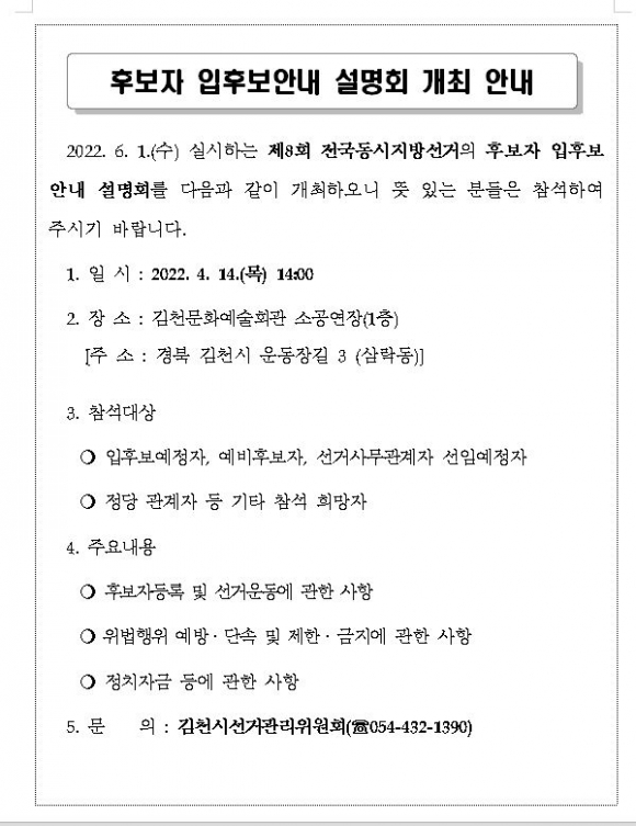 김천시선거관리위원회는 2022년 6월 1일 실시하는 제8회 전국동시지방선거를 대비하여 예비후보자, 입후보예정자, 선거사무장·회계책임자 선임예정자, 정당관계자 등을 대상으로 4월 14일(목) 오후 2시 김천문화예술회관 소공연장(1층)에서 ‘후보자 입후보안내 설명회’를 개최한다고 밝혔다.