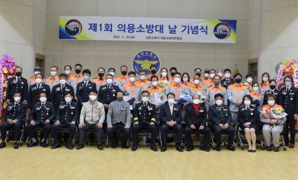 김천소방서(서장 전우현)는 29일(화) 14시에 김천소방서 2층 대회의실에서 의용소방대의 역사를 기념하고 숭고한 봉사와 희생정신을 기리는 제1회 의용소방대의 날 기념식을 개최했다고 밝혔다.이날 제1회 의용소방대의 날 행사에는 김충섭 김천시장, 이우청 김천시의회 의장, 나영민 김천시의회 부의장, 박판수 경상북도의회의원, 의용소방대원 등 130여명이 참석했다.행사는 코로나19 확산방지 방역수칙을 준수하여 진행됐으며, 화재·구조·구급 등 각종 재난 현장과 대민봉사 활동에 헌신하는 의용소방대원 36명을 표창하고 그동안의 노고를 치하했다.전우현 김천소방서장은 “제1회 의용소방대의 날을 진심으로 축하드린다”며 “각종 재난ㆍ재해 사고현장에서 몸을 아끼지 않고 헌신 노력한 의용소방대원의 노고에 진심으로 감사드린다”고 말했다.