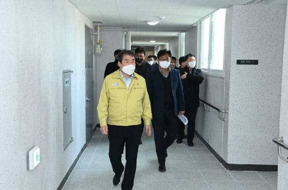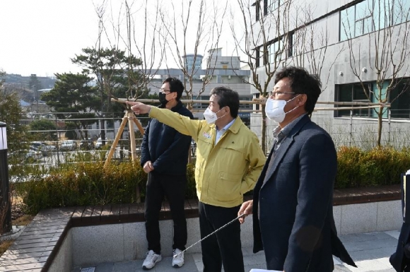 김충섭 김천시장은 준공을 앞두고 있는 평화동 복합문화센터 신축공사 현장을 방문하여 사업진행 상황을 점검했다.이날 현장 점검은 4월 준공을 앞두고 하자보수 등 안전여건 등을 확인하고 현장관계자들의 애로사항을 청취하는 한편 입주하게 될 각 사업소의 준비상황에 대해 보고를 받았다.