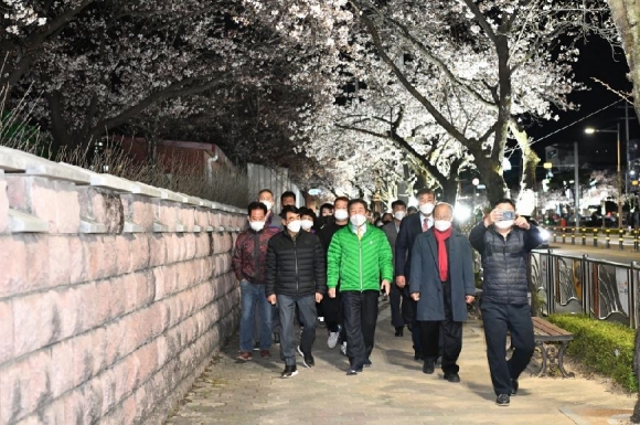 김천시(시장 김충섭)는 벚꽃이 개화하는 시기를 맞이하여 송설로 일대에 벚꽃 경관조명을 설치하고 점등 행사를 개최했다. 이날 행사에는 김충섭 김천시장을 비롯하여 시의원, 대곡동 단체장, 통장, 부곡맛고을 상인회장 등이 참석했다. 참석자들은 대곡동행정복지센터를 출발하여 경관조명이 설치된 아름다운 벚꽃길을 약 600m 정도 걸으며 아름다운 벚꽃길을 감상하며 행사를 축하했다.이 경관조명 사업은 연화지 및 직지사 벚꽃길 못지않게 아름다운 송설로 벚꽃길을 널리 알리고 많은 시민들이 이용할 수 있게 하기 위해 추진되었다. 송설로 경관조명은 대곡동행정복지센터에서 부곡우체국까지 약 600m를 벚나무 가로수 양방향으로 불을 밝히게 되며, 벚꽃이 개화하고 질 때까지 매년 운영할 계획이다. 전국적으로 널리 알려진 연화지와 직지사 벚꽃길에 더하여 송설로 벚꽃길을 관광자원화 함으로써 부곡맛고을을 비롯한 김천일대의 지역경제 활성화에 활력을 불어넣을 것으로 기대하고 있다.대신동에 사는 시민 이모씨는 “저녁약속이 있어서 근처를 방문했는데 거리가 너무 환하고 예뻐요. 벚꽃이 더 만개하면 가족들과 여기 와서 저녁도 먹고 사진도 찍으며 봄을 즐길 예정입니다.”라며 소감을 밝혔다.한편 최재명 도로철도과장은 행사에서 “아름다운 김천의 벚꽃길을 김천시민뿐만 아니라 널리게 알리게 된 계기가 된 것 같아 기쁩니다. 앞으로도 도시경관조명사업을 지속적으로 발굴하고 추진하여 아름다운 도시 및 『시민 모두가 행복한 김천』을 만들어 가겠습니다.”라며 소감을 밝혔다.