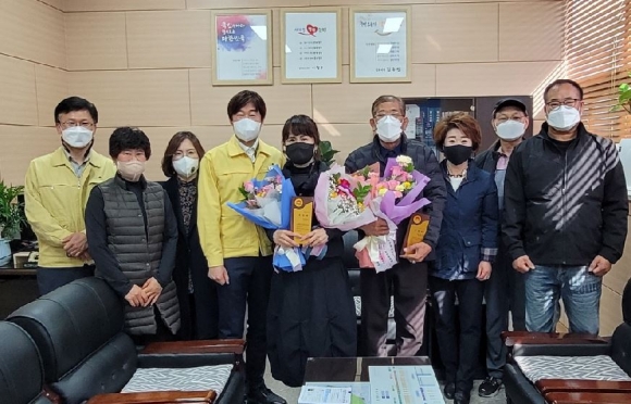 지좌동 행정복지센터(동장 임재춘)은 4월 1일(금) 9시 지좌동장실에서 전계숙 시의원 등이 참석한 가운데, 2022년 1분기 모범 통장 및 시민 표창패수여식 행사를 가졌다.이번 수여식은 시정 목표인「시민 모두가 행복한 김천」건설을 위해 앞장서고 시민 화합 및 복리 증진을 위해 노력한 모범 통장 및 시민에 대한 자긍심 고취를 위해 개최되었으며, 표창패 수여, 꽃다발 전달 및 기념촬영, 간담회 순으로 진행되었다.김천시에서는 매년 분기별로 사회봉사 및 선행 실천 시민 등 시정 발전에 기여한 숨은 보석을 발굴하고자 각계각층의 추천을 받아 표창패를 전수하고 있으며, 1분기 지좌동에서는 장영현 22통장(모범이통장)과 현)지좌동바르게살기협의회 이정욱 사무장(모범시민)이 수상의 영예를 안았다.장영현 22통장은 평소 솔선수범하는 자세로 산불예방활동 및 각종 시정사업 홍보에 앞장서 왔으며, 특히 코로나19 백신접종, 상생국민지원금 접수 등 코로나19 업무에 기여한 바가 큼에 따라 그 공을 인정받았으며, 이정욱 바르게살기협의회 사무장 또한 코로나19 방역 봉사활동 참여 및 Happy together 김천 운동 생활화 실천, 김천愛 주소갖기 운동 홍보 등 시정에 적극 참여한 공을 인정받았다.임재춘 지좌동장은 “우리시의 발전은 각자의 위치에서 시정 발전을 위해 묵묵히 맡은 바 일에 최선을 다해주시는 시민들이 있었기에 가능하다”고 말하며, “오늘 수상하시는 두 분에게 진심으로 축하의 말을 전하며, 앞으로도 더욱더 시민 화합 및 복리 증진을 위해 앞장서 주시길 바란다.”고 당부했다.