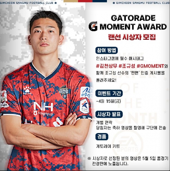김천상무프로축구단(대표이사 배낙호) 조규성이 프로축구연맹에서 발표한 3월 게토레이 ‘G MOMENT AWARD’ 수상자로 선정됐다. 조규성은 지난 3월 6일 김천종합운동장에서 열린 FC서울과 홈경기에서 후반 13분, 이영재의 패스를 받아 강력한 왼발 슈팅으로 상대 골망을 흔들며 선제골을 터뜨렸다. 해당 득점은 3월의 가장 역동적인 골로 선정됐다.게토레이 ‘G MOMENT AWARD’는 게토레이와 K리그가 매월 승리팀의 득점 중 가장 역동적인 골을 넣은 선수에게 수여하고 있는 상이다. 조규성은 3월 수상을 놓고 이승우(수원FC)와 경쟁해 승리하며 수상의 주인공이 됐다. 조규성은 현재 K리그1 득점 선두를 달리고 있다. K리그1 7라운드 아디다스 포인트도 1등을 기록 중이다.조규성은 “김천 구단 최초로 상을 수상하게 돼 영광이다. 수상을 위해 투표해주신 팬분들께 감사하다. 앞으로 공격수로서 더 많은 득점을 위해 최선을 다하겠다”고 말했다.한편, 김천상무는 15일(금)까지 인스타그램을 통해 조규성의 랜선 시상자를 모집한다. 김천상무, 조규성, GMOMENT를 해시태그를 포함해 인스타그램 게시물에 올리면 응모가 완료되며, 당첨자의 축하 영상은 내달 5일 김천상무 홈경기 시 전광판을 통해 노출될 예정이다.