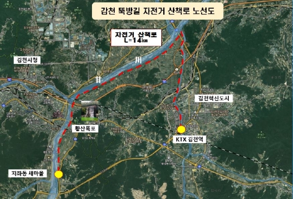 김천시(시장 김충섭)는 최근 코로나19 장기화에 따라 자전거를 활용한 생활스포츠 이용자가 증가하고 있는 추세에 발맞춰 시민 여가활동과 건강 증진을 위해 감천(甘川) 뚝방길을 활용한 자전거 산책로를 조성 할 계획이라고 밝혔다.자전거 산책로 조성사업은 김천혁신도시에서 시작되는 율곡천과 감천의 뚝방길 14㎞구간에 총사업비 5억원이 투입되며, 금년 상반기 기본계획 및 실시설계를 거쳐 본격적인 사업에 착수할 계획이다.본 사업은 지좌동 새마을에서 KTX김천역 구간 내에 자전거 휴게 쉼터 조성과 안내판을 설치하는 등 각종 편의시설을 확충하고 단절구간을 연결하여 자전거 이용자들에게 보다 안전하고 쾌적한 라이딩 환경을 제공 할 계획으로 감천변의 아름다운 자연경관을 함께 즐기는 라이딩 명소로서 자전거 동호인들의 인기를 끌 전망이다.또한, 오봉저수지 주변 개발사업과 연계하여 혁신도시에서 오봉저수지 간 자전거 도로 확충사업도 계획하고 있어 김천시가‘자전거타기 좋은 도시 김천’으로 한층 업그레이드 될 것으로 기대하고 있다.김천시 관계자는 “친환경 생활교통수단이자 건강한 취미‧레저 활동으로 정착한 자전거를 시민들이 보다 안전하고 편리하게 즐길 수 있도록 시설확충에 최선을 다하겠다”라고 말했다.