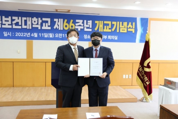 어려운 대외여건 속에서도 혁신을 통해 경북 최고의 고등교육기관 역사 창조경북보건대학교(총장 이은직)는 개교 66주년을 맞아 11일 본관 2층 소회의실에서‘경북보건대학교 제66주년 개교기념식’을 거행했다.기념식은 개식사, 국민의례, 이은직 총장 기념사, 포상자 시상, 축하 시루떡 자르기, 신임 교직원 소개, 교가 제창 등의 순서로 진행됐다. 기념식은 코로나 상황으로 인해 대학관계자 및 수상자로 한정하여 진행됐다.이날 기념식에서는 15년간 재직하면서 경북보건대학교 발전에 이바지한 공로로 행정지원처 김정환 과장이 15년 장기근속패를 받았다. 그리고, 매년 학령인구 급감하는 어려운 상황에서도 다양한 입학전형 및 대학 홍보 활동에 앞장서 헌신적인 노력을 기울인 공로로 보건복지과 김승환 부교수, 뷰티디자인과 이세희 부교수, 간호학부 학부장 백경화 부교수, 간호학부 김낙주 조교수, 간호학부 이지아 조교수, 간호학부 함근영 조교수가 공로상을 받았다.또한, 대학입시 및 홍보업무에 헌신적인 노력을 기울인 공로로 입학홍보센터 여환범 팀장, 이상민 계장, 이지영 선생이 공로상을 받았다.이은직 총장은 66주년 기념사를 통해 “학령인구감소와 대학구조조정이라는 대내외 어려운 여건 속에 직면했다.”라며, “우리 대학은 고등교육기관으로서 본질에 충실하며, 학생들의 교육 만족도 향상을 최우선으로 학생들이 다니고 싶은 대학이자, 동문이 자부심을 느끼는 대학으로 거듭날 수 있도록 대학 구성원 모두가 최선을 다할 것.”이라 밝혔다.한편, 경북보건대학교는 교육부 기본역량진단평가에서 자율개선대학으로 선정되었으며, 혁신지원사업 연차 평가에서는 최우수 대학으로 선정됨으로써, 지속적인 교육의 혁신을 통해 대학의 우수성을 입증했으며, 중장기 발전계획을‘보건의료 특성화 선도대학’, ‘학생 중심의 교육과정 혁신대학’,‘산학협력 교육과정 혁신대학’으로 재정비 설정했으며 학생의 교육 만족도를 최우선으로 경북보건대학교를 혁신해 나가고 있다.