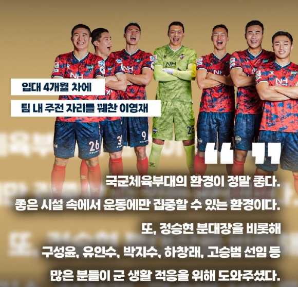 김천상무에는 국가대표급 기량을 가진 선수들이 즐비해 있다. 조규성, 권창훈 등 꾸준히 벤투호에 승선하는 선수들은 항상 세간의 관심사가 되기 마련이다. 지난해 K리그2에서 1년 만에 K리그1으로 직행 승격한 이후에도 김천은 K리그1 중위권을 지키며 치열한 순위 다툼을 하고 있다. 김천의 K리그1에서의 선전을 이끄는 김천의 언성히어로들 이른바 천성히어로를 만나보자. [편집자주]마지막 주인공은 이영재다. 이영재는 지난해 12월 27일 입대한 일병으로 팀 내 계급 상 가장 막내다. 계급으로는 가장 막내이지만 프로 경력으로는 베테랑 급이다. 2014년 용인대학교 2학년을 마친 후, K리그 드래프트에서 자유계약 선발로 안현범, 김승준과 함께 자유계약으로 울산현대에 입단했다.이영재는 “2015년에는 구단 당 세 명 씩 자유계약으로 입단할 수 있었다. 대학생 때는 자유계약이 제일 좋은 계약이었는데 대우를 받고 입단하게 돼 기뻤다. 좋은 조건으로 가게 돼 영광스럽고 기분이 정말 좋았다”고 회상했다.이어 “프로에 입단할 수 있도록 학생 선수 시절에 많은 도움을 주셨던 은사님들이 생각난다. 장훈고 이규준 감독님, 용인대 이장관 감독님 등등 감독님들 밑에서 정말 많은 것을 배웠다. 축구다운 축구를 하게 해주셨던 은사님들께 감사하다”고 덧붙였다.울산 입단 후 프로 첫 해 10경기 출장 1득점 2도움을 기록한 이영재는 2018년까지 울산현대에서 뛰다 2019년 경남을 거쳐 같은 해 후반기 강원에 입단했다. 강원에서 두 시즌동안 8골 6도움을 기록했고 2021년 수원FC 이적 후 30경기에서 5골 7도움을 올리며 커리어 하이를 작성했다. 이영재는 2022 시즌 프로 8년차에 165경기 21득점 25도움의 기록으로 괄목한 만한 공격 포인트를 기록 중이다.김천에서 맞은 첫 시즌에서도 1R 울산전 교체 출장을 제외하고는 전 경기에 출장하며 신병으로서 최고의 첫 해를 소화하고 있다. 지난 8R 성남FC전에서는 후반 25분 교체 이전까지 멀티 도움을 기록하며 수훈선수로 꼽혔다. 경기 직후 도움 해트트릭에 대한 언급이 있기도 했지만 아쉽게 인정되지 않으며 멀티 도움을 기록했다. 이영재는 올 시즌 9경기에서 3도움을 기록 중이다.이에 대해 이영재는 “첫 골은 사실 뛰면서도 도움이 아닐 거라고 생각했다. 도움 해트트릭을 할 수 있던 기회가 프로에서 2번 정도 있었는데 아쉽게 무산됐다. 앞으로 더 열심히 하면 도움 해트트릭을 달성할 수 있는 기회가 올 거라고 생각한다. 최선을 다하겠다”고 설명했다.입대 4개월 차에 팀 내 주전 자리를 꿰찬 이영재는 군 생활에 대해서도 입을 열었다. 이영재는 “일단 국군체육부대의 환경이 정말 좋다. 좋은 시설 속에서 운동에만 집중할 수 있는 환경이다. 또, 정승현 분대장을 비롯해 구성윤, 유인수, 박지수, 하창래, 고승범 선임 등 많은 분들이 군 생활 적응을 위해 도와주셨다”고 말했다.입대와 동시에 국가대표로도 선발되며 이영재는 최고의 2022 시즌을 보내고 있다. 이영재는 ‘2022년 1월 전지훈련 국가대표팀 소집 명단’에 포함되며 아이슬란드와 친선경기에 출전하기도 했다. 이후 대표팀과 연은 없었지만 대표팀 재승선을 위해 꾸준히 노력하고 있다.이영재는 “김천에서 경기에 꾸준히 나서고 있지만 조금 더 좋은 모습을 보여야 한다. 부족한 면을 보완하면 기회를 잡을 수 있지 않을까 싶다. 권창훈 선수를 비롯해 박지수, 구성윤, 조규성 등 선임들이 대표팀에 선발되는 것을 보면서 항상 동기부여가 생긴다. 올 시즌을 잘 치르고 기회를 잡기 위해 노력하겠다”고 전했다.이어 “올 시즌 개인적인 목표는 두 자리 수 공격 포인트이다. 작년에 수원FC에서 커리어하이를 달성하면서 시상식까지 노렸지만 가지 못했다. 올 시즌에는 김천에서 좋은 모습을 보여서 시즌 종료 후 구단 대표로 시상대에 서고 싶다”는 각오를 밝혔다.