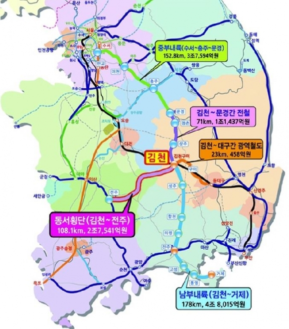 지난 제4차 국가철도망구추계획에 장기검토사업으로 반영되어 ‘21년 12월 사전타당성 조사용역 착수한 “김천~전주간 철도건설사업”이 본격적으로 추진되고 있다.26일 국토교통부 관계자를 비롯해 국가철도공단 일행이 김천시를 방문하여 현장조사를 실시했다.전라북도 전주시에서 시작해 진안·무주군을 거쳐 김천시까지 연계되는 본 노선은 그간 경상북도, 전라북도를 비롯한 철도 통과노선 지자체장의 공동건의문과 시민들의 호소문 제출 등을 통해 우여곡절 끝에 제4차 국가철도망 구축계획에 반영되어 사전타당성조사용역을 착수하게 되었다.이번 실사는 사전타당성조사를 위한 기본 노선 선정 과정으로 현재 김천시에 추진되는 남부내륙(김천~거제)철도, 중부내륙(김천~문경), 대구광역권전철(김천연장) 2단계 등을 종합적으로 고려하여 최적의 노선을 선정할 계획으로 본 노선에 따라 타당성조사를 진행하게 된다.용역은 금년 12월 완료할 계획으로써, 김천시는 국토교통부와 경상북도 및 전라북도를 비롯해 철도통과 시군과 적극적인 공조를 펼쳐 경제성 확보를 위해 총력을 기울일 계획임을 밝혔다.한편 동서횡단철도(김천~전주)는 총연장 101.1㎞의 2조 8천억 원이 소요되는 대형 국책사업으로 현재 김천에서 전주로 이동하기 위해 열차를 이용시 약 3시간가량 소요되고 있으나, “김천~전주선” 철도가 건설되면 김천에서 전주까지 직통 40분대에 이동할 수 있어 시간 및 운임부담을 절감할 수 있다.김천시 관계자는 “김천~전주선이 확정되면 대통령 당선인 공약사항인 김천~신공항~의성 연계노선도 병행 추진할 계획으로 이는 지역 간 연계성 제고와 균형발전에 이바지할 것으로 기대되며, 특히 새만금과 신공항을 통한 환황해 경제권의 물류수송 연계 네트워크가 동해권 까지 연결됨으로써 김천시가 영·호남 물적 경제 교류의 중심지가 될 것으로 전망되고 있다”라고 말했다.
