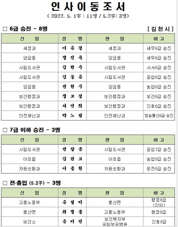 김천시는2022년 5월1일자 인사이동조서를 아래와 같이 발표했다.