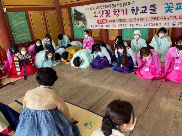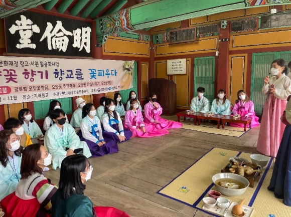 오얏꽃 학당 프로그램은 (사)우리문화돋움터(이사장 배수향)에서 주관하여 김천대학교 외국인 유학생 30명을 대상으로 절기에 맞춰 우리나라 전통문화를 총 5회 체험학습을 하는 프로그램으로 이번 회차는 향교의 역사적 의미, 다도예절, 한복 입는 방법, 공예품 만들기 등을 체험하며 한국문화유산을 학습하는 시간을 가졌다.