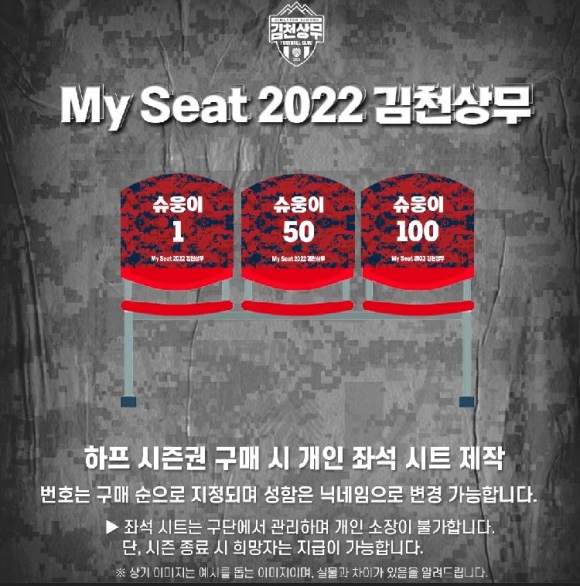 김천상무프로축구단(대표이사 배낙호)이 5일 오전 10시부터 온라인 티켓링크, 오프라인 사무국 및 홈경기 시 장외부스를 통해 ‘My Seat 2022 김천상무’ 판매를 시작한다. ‘My Seat 2022 김천상무’는 김천상무 하프 시즌권이며 1일부터 31일까지 100개를 한정 판매한다. 시즌권 카드에는 좌석번호, 이름이 인쇄되며 5월 둘째 주부터 주 1회 순차적으로 발송할 예정이다. 시즌권 패키지는 5월 14일 경기부터 현장 수령도 가능하다.구매자는 한 시즌 동안 자신의 좌석을 점유하게 되며 별도의 사전 예매 또는 발권 없이 전용 게이트에서 입장 가능하다. 랜야드, 시즌권 특화 전사머플러 등 한정판 시즌권 패키지도 증정한다. 하프 시즌권은 타인에게 양도 및 재판매 할 수 없으며 취소기한은 구매일로부터 7일 이내이다.2022시즌 하프 시즌권은 정규리그 11경기 및 파이널 라운드 홈경기 포함 기준으로 6월 17일 홈경기부터 적용되며 파이널 라운드 진행 시, 해당 경기도 포함된다. 가격은 성인 120,000원, 학생 100,000이며 1매 당 시즌 내내 앉을 자리(테이블석 제외)를 선택하는 지정좌석제로 운영한다.가변석 좌석에는 시즌권 구매자명이 인쇄된 특화 의자커버를 특별 제작해 설치할 예정이다. 또한 가변석 관중 출입 동선 내 모니터에 시즌 회원 명, 좌석번호 안내를 통해 시즌권 구매자들을 맞을 예정이다. 시즌권 구매자 선착순 15명에게는 국가대표(조규성, 권창훈, 박지수 중 1인) 친필사인이 담긴 폴라로이드 사진과 액자를, 이후 15명에게는 국가대표(조규성, 권창훈, 박지수 중 1인) 친필사인 폴라로이드 사진을 증정한다.하프 시즌권 구매자에 한해 동반 1인 50% 할인 혜택을 제공하며 시즌권 구매자 출석체크 이벤트를 통해 시즌 종료 후 MD를 증정할 예정이다.한편, 하프 시즌권은 기존에 구단에서 판매하는 사용자 미 지정, 횟수 차감형의 티켓북과는 차별성을 지닌다. 티켓북은 1권 당 20장이 포함돼있어 타인과 함께 사용이 가능한 형태로 단체 관람 시에 용이하다.