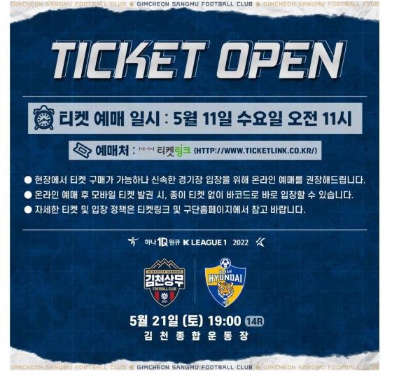 김천상무프로축구단(대표이사 배낙호)이 11일 오전 11시, 온라인 예매 사이트 티켓링크를 통해 21일 오후 7시, 김천종합운동장에서 열리는 ‘하나원큐 K리그1 2022’ 14R 울산현대와 홈경기 티켓 예매를 시작한다.김천은 21일 울산전에서 부부의 날을 맞아 ‘둘(2)이서 하나(1)되는 김천상무 패밀리’ 컨셉의 홈경기를 개최한다. 장외구역 및 하프타임에 가족 단위가 함께 참여할 수 있는 이벤트를 진행할 예정이다.다양한 이벤트가 펼쳐지는 김천상무 홈경기의 예매 가능 구역은 가변석A(W구역), 테이블석(T구역), 가변석B(N구역), 일반석(A1~A3-1구역, B구역, I구역), 원정석(G구역)이다.테이블 석은 전 연령 15,000원이며 개별 1인 단위로 판매한다. 가변석은 구역 별로 가격이 상이하다. W구역은 성인 12,000원, 학생 10,000원이며 N1 및 N4 구역은 전 연령 10,000원이다. N2, N3(스탠딩) 구역은 성인 7,000원, 학생 5,000원이다. 일반석은 성인 10,000원, 학생 8,000원이다. 원정석은 성인 12,000원, 학생 10,000원이다. 5일부터 온·오프라인을 통해 내 자리를 지정할 수 있는 김천상무 하프 시즌권도 판매 중이다.가변석 예매자는 가변석 출입구를 통해 입장할 수 있고, 일반석(A1~A3-1구역, B구역, I구역) 예매자는 외7문으로, 원정석(G구역) 예매자는 외6문으로 입장 가능하다.홈경기 티켓은 경기 당일 현장 구매도 가능하지만 온라인 예매를 통한 모바일 티켓 이용 시 발권 없이 신속하게 입장할 수 있다.