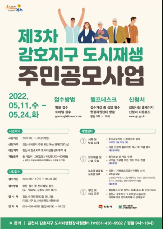 김천시는 감호지구 도시재생에 대한 이해와 참여를 높이고 지역공동체를 활성화하기 위해 ‘제3차 감호지구 도시재생 주민공모사업’을 추진한다고 밝혔다.이번 공모사업은 감호지구 도시재생 및 공동체 활성화 등에 적합한 사업을 직접 제안하고 실행하여 도시재생사업에 대한 이해와 참여 기회 제공, 마을공동체 역량 강화, 지속 가능한 도시 기반 구축을 위한 도시재생 뉴딜사업으로 김천시 소재 3인 이상으로 구성된 비영리 주민 모임 또는 단체가 참여할 수 있으며, 총사업비 1,080만원으로 사업당 최소 200만원 ~ 최대 500만원을 지원한다.접수 기간은 이달 24일까지이며 김천시청 홈페이지에서 공고와 신청양식을 확인할 수 있으며, 원활한 공모 접수를 돕기 위해 감호지구 도시재생현장지원센터에서 접수기간 내 사전 예약제로 헬프데스크를 운영할 예정이다.김천시 관계자는 “지역 자원을 활용해 주민들의 자발적인 참여와 새로운 아이디어로 지역 문제를 함께 해결할 수 있는 소통의 계기가 되기를 바란다”라고 말했다.한편 감호지구 도시재생 뉴딜사업은 지난 2020년 4월 승인ㆍ고시되었으며 국비 141억을 포함 총 263억원을 투입하여 2024년 사업준공을 목표로 해피러닝어울림플랫폼, 정정당당 은빛복지센터, 보행자 안전 우선도로 및 공영주차장 조성 등을 통해 주민들의 삶의 질 향상과 도심기능 회복 및 지역경제 활성화를 추진하는 사업이다.