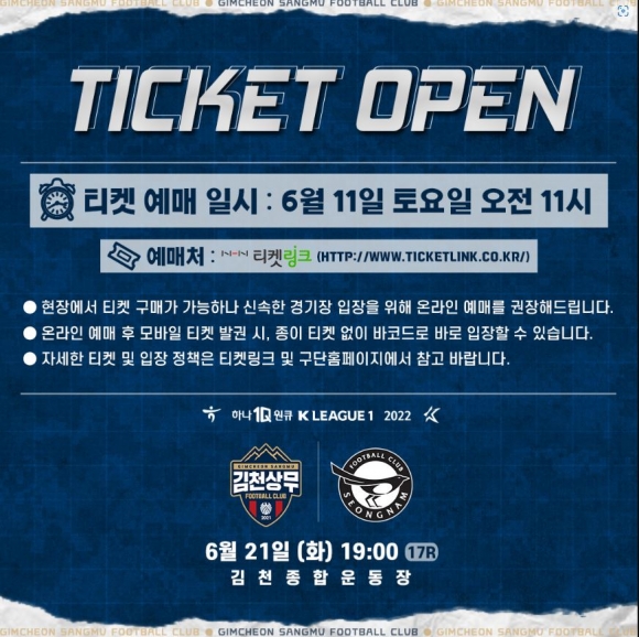 김천상무프로축구단(대표이사 배낙호)이 11일 오전 11시, 온라인 예매 사이트 티켓링크를 통해 21일 오후 7시, 김천종합운동장에서 열리는 ‘하나원큐 K리그1 2022’ 17R 성남FC와 홈경기 티켓 예매를 시작한다.김천은 21일 성남FC전 홈경기에서 호국보훈의 달을 맞아 순국선열과 호국영령의 애국정신을 기리기 위한 이벤트를 실시한다. 선수단 입장 시 6.25 참전 국가유공자회 김천시지회의 호국영웅들과 함께 입장하며 선수단은 호국보훈의 달 특별 유니폼을 입고 경기에 출전한다. 장외에서는 선수 활용 호국보훈 관련 이벤트를 개최할 예정이다.다양한 이벤트가 펼쳐지는 김천상무 홈경기의 예매 가능 구역은 가변석A(W구역), 테이블석(T구역), 가변석B(N구역), 일반석(A1~A3-1구역, B구역, I구역), 원정석(G구역)이다. 하프 시즌권 구매자는 별도의 예매 및 발권 없이 시즌권 지참 후 전용 게이트로 바로 입장한다.