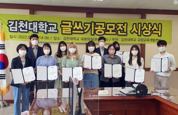 김천대학교(총장 윤옥현) 교양교육개발센터(센터장 송희원)에서는 교양필수 교과인 ‘교양글쓰기’와 비교과프로그램인 ‘자기표현력강화프로그램‘(지도교수 송대헌)’의 성과 확산을 목적으로 글쓰기 공모전을 진행하였다고 15일 밝혔다.이번 공모전에서는 제시된 세 가지의 사진 중 하나를 선택하여 주제를 정하고 자유로운 형식의 글을 쓰도록 하였다.6월 14에 실시한 글쓰기 공모전 시상식에서는 대상 사회복지전공 오순희, 최우수상 안경광학과 노경협, 우수상 물리치료학과 이서영, 장려상 간호학과 고은정, 김다래, 고은숙, 최나연, 김민정 학생 총 8명에게 상장과 상금을 전달하였다.교양교육개발센터 송희원 센터장은 "자유로운 글쓰기 활동을 통해 자기표현력 및 창의력 증진과 의사소통역량 함양에 도움이 될 것이라"며, "앞으로도 의사소통역량뿐만 아니라 우리 대학의 핵심역량 함양을 위해 다양한 교과와 비교과를 운영하고 교양교육과 관련한 연구를 확대해 나갈 것이다."라고 밝혔다.
