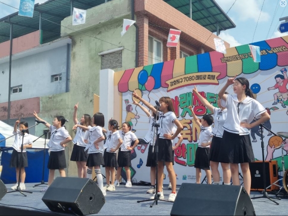 김천동신초등학교부설 지역공동 음악영재학급(원장 이미영)은 6.18.(토)에 있었던 감호지구 아랫장터 축제 한마당에서 합창 공연을 펼쳤다.7080 레트로 축제라는 주제에 걸맞게 김천동신초등학교부설 지역공동 음악영재학급 학생들은 ‘빨간머리 앤’, ‘꼬마자동차 붕붕’, ‘달려라 하니’등 추억이 담긴 애니메이션 메들리 공연을 펼쳤다. 귀여운 학생들의 합창 공연에 관람객들은 흐뭇한 미소를 지으며 자신의 어릴 적 모습을 떠올렸다.지역공동 음악영재학급 학생으로 공연에 참여한 농소초등학교 6학년 학생은 “만화영화를 보지는 못했지만 익숙한 곡이라 즐겁게 연습할 수 있었습니다. 무대에 올라가기 전에는 긴장됐지만 많은 관객께서 흐뭇한 얼굴로 응원해주시고 즐겁게 공연을 즐겨주셔서 무사히 무대를 마칠 수 있었습니다. 값진 경험을 할 수 있도록 도와주신 모든 선생님께 감사합니다.”라는 소감을 남겼다.아랫장터 축제 한마당은 김천시 감호지구 도시재생 뉴딜 사업을 일환으로 쇠퇴한 감호지구에 활력을 불어넣기 위해 김천 시민 누구나 즐길 수 있는 축제로 기획되었다.