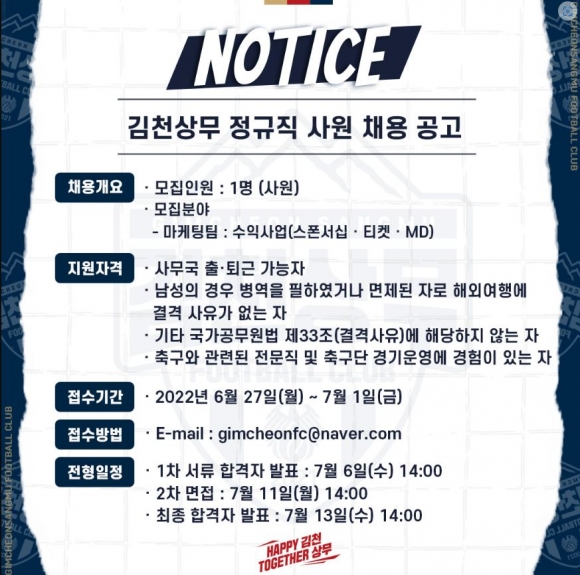 김천상무프로축구단(대표이사 배낙호)이 27일(월)부터 7월 1일(금) 오후 6시까지 정규직 직원 채용을 실시한다. 채용 분야는 마케팅팀 사원 1명이며, 스폰서십, 티켓, MD 등 수업사업 업무를 맡는다. 축구 또는 스포츠 산업 분야 유 경험자를 우대한다.서류 접수는 27일부터 내달 1일 오후 6시까지이며 구단 홈페이지에서 관련 서류를 다운 받아 작성 후 구단 이메일(gimcheonfc@naver.com)로 제출하면 된다.서류 합격자는 7월 6일(수) 오후 2시에 발표하며 면접 전형은 11일(월) 오후 2시에 실시 예정이다. 최종 합격자 발표는 13일(수) 오후 2시이며 공식 홈페이지 게시 및 개별 통보한다.모집 부문 별 응시자격 등 자세한 사항은 김천상무프로축구단 공식 홈페이지 공지사항에서 확인할 수 있다.