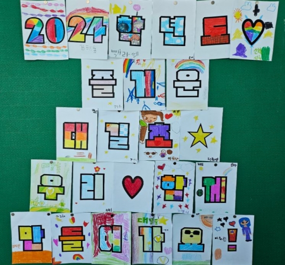 이어서 22명의 전교생이 모두 자기소개를 하고, 2024학년도 대길초등학교 다모임 활동의 슬로건 문구를 디자인하였다. ‘2024학년도♡ 즐거운 대길초☆ 우리♡함께 만들어 가요!’라는 문장을 각자 한 글자씩 디자인하여 멋진 문장으로 표현하였다.