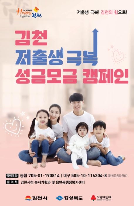 김천시(시장 김충섭)는 저출생 극복을 위한 다양한 정책 발굴과 지원을 위해 행정력을 집중하고 있는 가운데 범시민 동참 분위기 조성을 위해 경북사회복지공동모금회와 함께 「저출생 극복 성금 모금 캠페인」을 전개한다.