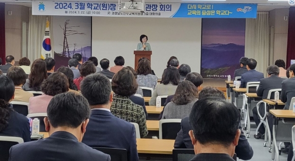 경상남도진주교육지원청(교육장 이외숙)은 22일 진주교육지원청 대회의실(3층)에서 학교(원)장 및 소속 기관장 100여 명이 함께 참여하는 학교장 회의를 개최하였다.