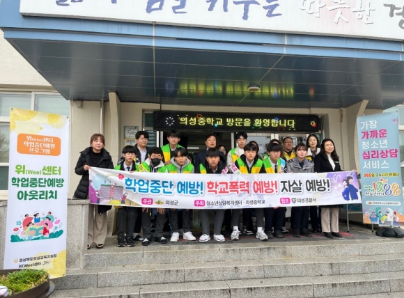 의성중학교(교장 장재익)는 3월 26일(화) 의성교육지원청 WEE센터, 의성경찰서, 의성군청소년상담복지센터와 협업하여 전교생을 대상으로 『학교폭력예방 캠페인』을 실시했다고 밝혔다.