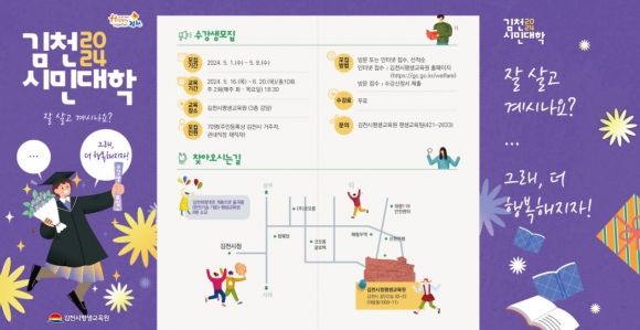 김천시평생교육원에서는‘잘 살고 계시나요?... 그래, 더 행복해지자!’라는 주제로「2024 김천시민대학」 수강생 70명을 5월 1일부터 5월 8일까지 선착순 모집한다고 밝혔다.