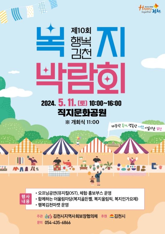 김천시(시장 김충섭)가 주최하고 김천시지역사회보장협의체(공동위원장 이은직)가 주관하는 『제10회 행복김천 복지박람회』가 5월 11일(토) 오전 10시부터 오후 4시까지 대항면 직지문화공원에서 개최된다.