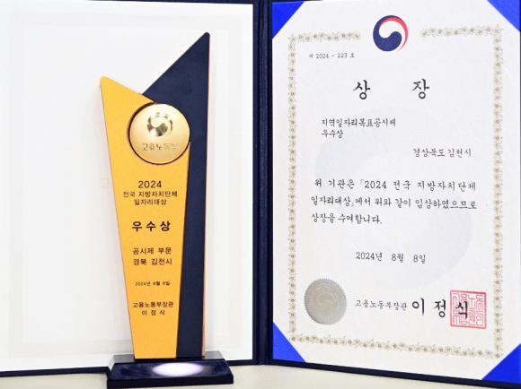 김천시(시장 김충섭)는 지난 8일(목) 서울 엘타워에서 개최된 2024년 전국 지방자치단체 일자리대상 시상식에서 우수상을 수상해, 2019년부터 2024년까지 공시제 부문 5년 연속 수상이라는 쾌거를 이뤘다고 밝혔다.
