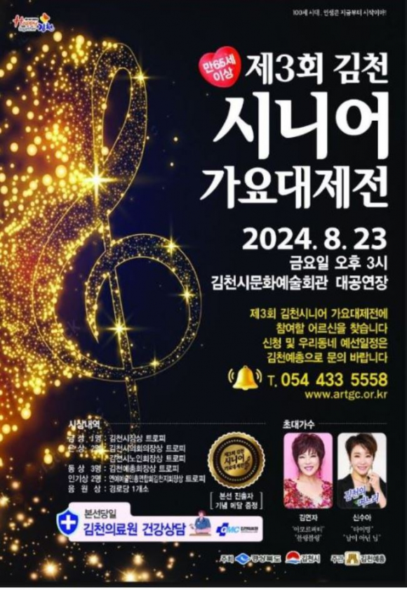김천 시니어 가요대제전은 경상북도와 김천시가 주최하고 한국예술인총연합회 김천지회가 주관하는 행사로, 관내 만 65세 이상의 어르신들이 노래에 대한 열정과 숨겨진 재능을 펼쳐 보이는 멋진 인생 무대이다.