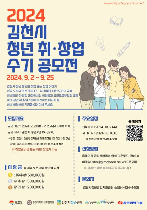 김천대학교(총장 윤옥현) 산학협력단(단장 김용준)에서는 김천시 청년들의 취업과 창업 이야기를 듣고자 『김천시 청년 취·창업 수기 공모전』을 개최한다고 30일 밝혔다. 이번 공모전은 김천시가 주최하고 김천대학교 산학협력단, 김천시 청년(창업지원)센터가 주관, 한국전력기술(주)이 후원하였다.