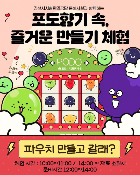 프로그램은 김천포도축제가 열리는 종합스포츠타운 보조경기장의 어린이 체험존에서 6일에서 9일까지 3일간 만나볼 수 있으며, 오전과 오후로 나뉘어 10시~11시, 14시~재료 소진 시까지 2회 진행된다.