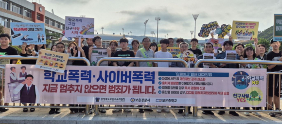 충청북도보은교육지원청(교육장 이은진)은 9일(월) 오전, 보은중학교에서 등교하는 학생들을 대상으로 학교폭력 예방 및 사이버 범죄 경각심을 높이는 캠페인을 실시했다.
